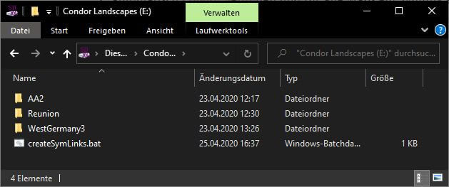 Ich habe also meine Landscapes auf eine NTFS formatierte SD Karte kopiert und zunächst manuall mit dem Befehl mklink einen Symlink in mein Condor2 Verzeichnis erstellt und es hat funktioniert. Die Ladezeit ist zwar etwas höher, weil die SD Karte natürlich langsamer ist als die Festplatte, aber das ist etwas womit ich leben kann.