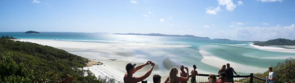 Nach dem Frühstück fahren wir immer noch eine Weile. Beim Whitehaven Beach legen wir an. Ich bin ja karger Worte und kann immer nicht so gut beschreiben (sage ich in einem ziemlich langen Artikel…). Oder vielleicht liegt es gar nicht an mir, sondern tatsächlich an der Sprache. Das ist im englischen noch schlimmer als im Deutschen. Da gibt es nur „nice“ oder „amazing“. Im deutschen haben wir da mehr Wörter. Ich wähle mal: beeindruckend. Der Whitehaven Beach ist, so werden wir aufgeklärt, das 4.-häufigste Fotomotiv Australiens nach dem Opernhaus und der Brücke in Sydney und dem Ayers Rock. Dennoch macht jeder Fotos. Auch ich. Denn es ist schon wie beim Taj Mahal. Man würde denken, alle Fotos wurden mit Photoshop gemacht, wenn man nicht da wäre. Doch neben der unheimlichen Schönheit dieses Ortes verfügt er auch über faszinierende physikalische Eigenschaften. Hier liegt der reinste Siliziumsand der Welt. Es ist natürlich verboten, welchen davon mitzunehmen. Die letzten, die das durften war angeblich die NASA, die das reine Silizium zum herstellen der Linse des Hubble-Teleskops verwendet hat. Jeder ist wohl schon mal Barfuß in Spanien über den Strand gelaufen und hat sich die Füße verbrannt. Das passiert hier nicht. Die Sonne knallt den ganzen Tag auf den Sand aber er hat eine angenehme Temperatur. Silizium speichert die Hitze aus irgendeinem Grund nicht.